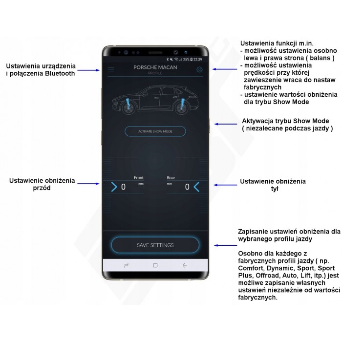 Moduł umożliwia dokładną regulację wysokości na każdym z fabrycznych trybów pracy plus dodatkowo tryb Show Mode - maksymalne obniżenie do celów pokazowych ( tylko podczas postoju )