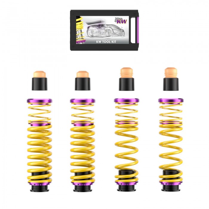 sprężyny śrubowe KW służą do obniżania pojazdu w połączeniu ze standardowymi amortyzatorami. W przeciwieństwie do konwencjonalnych zestawów sprężyn, możliwa jest indywidualna regulacja wysokości w testowanym zakresie. To rozwiązanie wykorzystuje mocowania sprężyn specyficzne dla danego pojazdu z dopasowanymi sprężynami obniżającymi KW, odpowiednimi elastomerami i systemami ochrony przed kurzem. Standardowy układ amortyzatorów, na przykład ze sterowaniem elektronicznym lub hydraulicznym, pozostaje aktywny.